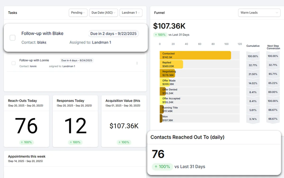 Track outreach volume, conversion rates and dozens of other KPIs visually. Landmen get clear priorities and follow-up reminders, while leaders gain a comprehensive view of performance across the entire acquisition operation — reducing blind spots, accelerating deal cycles, and ensuring no opportunity is lost.